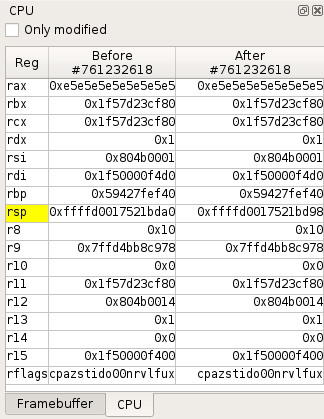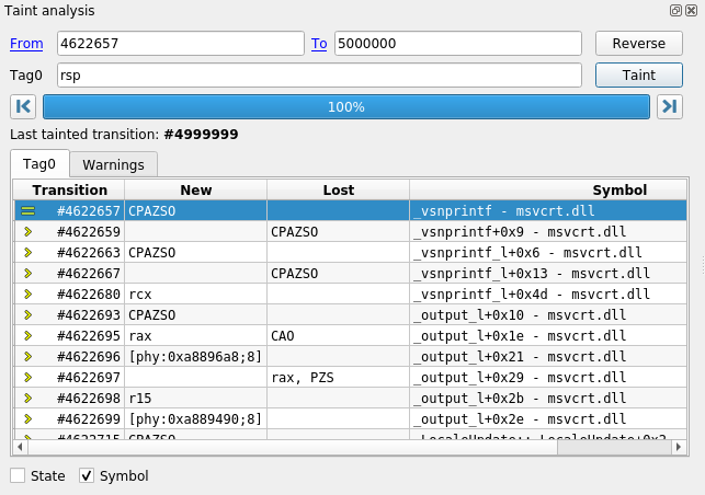 {mov rax, rbx; xor rax, rbx}, thexoralways resetsraxto 0.). This inference may result in surprising displays in the table views, in backward (some register may lose the taint at one instruction, and some memory may "regain" the taint, apparently from nowhere). This is simply a display limitation and does not otherwise affect the correctness of the taint. - Tainting large ranges of memory (several MB) may result in a very slow taint that uses a lot of CPU.