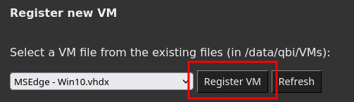 Register a new VMsection. - Ensure the disk file we uploaded is selected in the combo box. If not, select it.