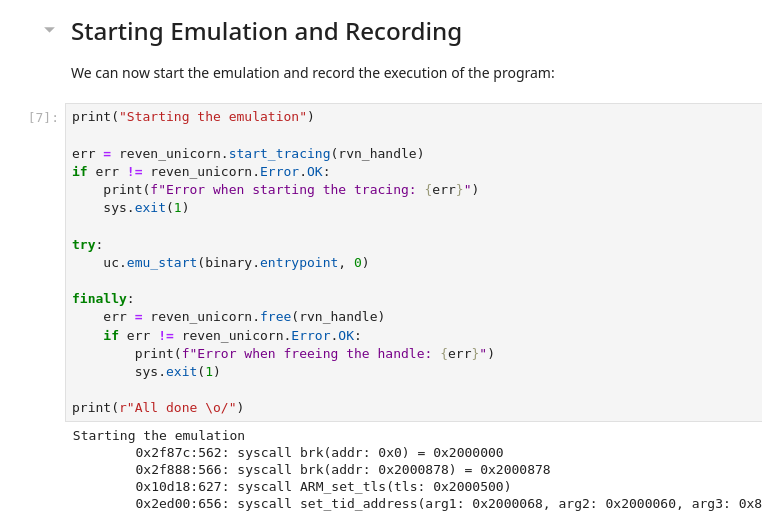 reven_unicornthat's easy to integrate in existing unicorn scripts. - esEmu, eShard's fork of QEMU that provides facilities such as hooks and fault injection. esEmu supports recording in a single address space, without support for MMU for now.